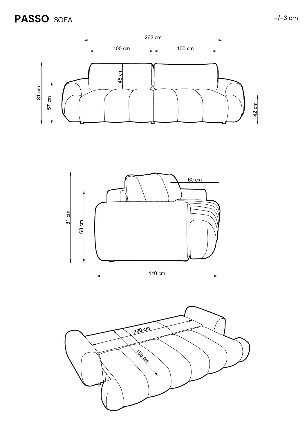🛋️ Lățime Impunătoare: Cu o lățime totală de 263 cm, piesa oferă un spațiu generos pentru întreaga familie, păstrând în același timp un profil modern cu o înălțime de 81 cm.